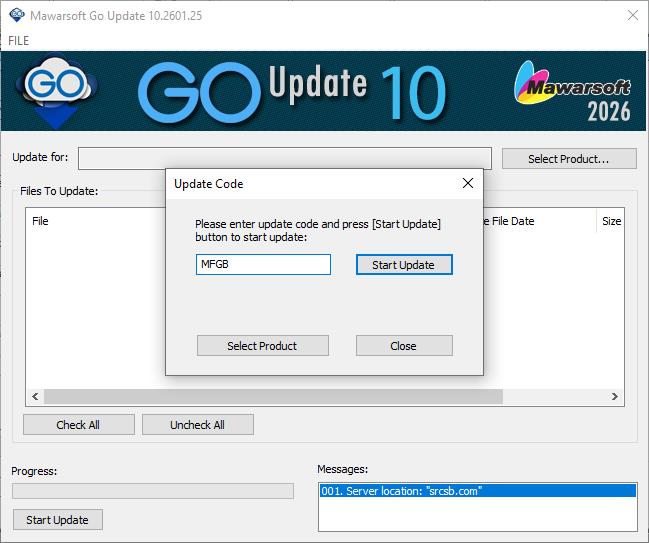 Untuk memasang perisian server Mawarsoft FlitGate Basic, jalankan perisian GoUpdate sekali lagi. Kali ini masukkan kod "MFGB". Tekan [Start Update] dan tunggu sehingga pemasangan selesai.