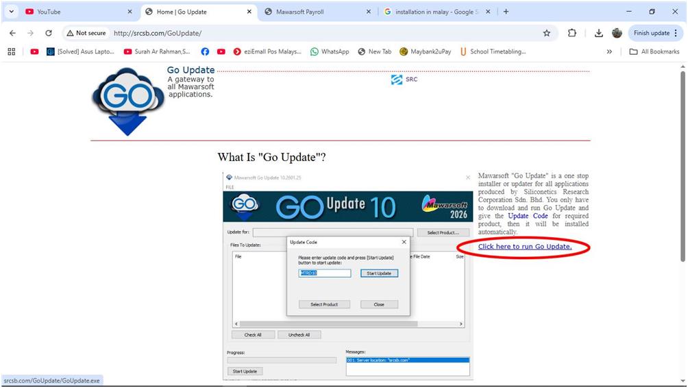 Lawati laman sesawang "http://www.srcsb.com/GoUpdate/", kemudian klik pautan "Click here to run Go Update". Apabila selesai, fail GoUpdate.exe akan dimuat-turun dan disimpan di folder "Download".