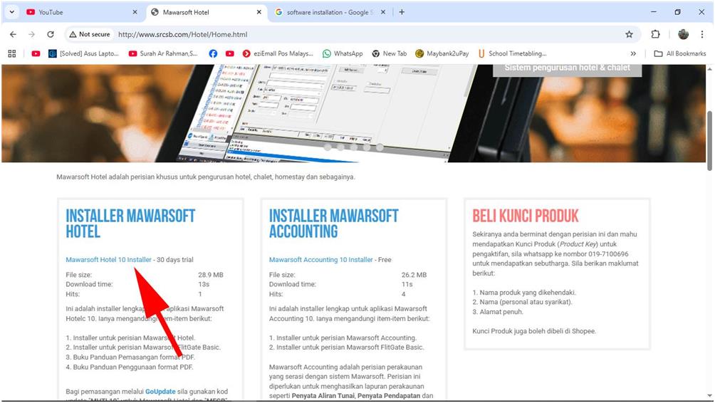 Anda boleh mendapatkan fail installer Mawarsoft Hotel dengan cara memuat turun fail "Mawarsoft Hotel 10.zip" daripada laman utama produk ini. Sila tekan pautan "Mawarsoft Hotel 10 Installer".