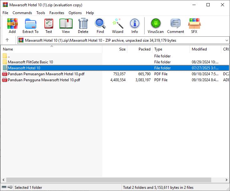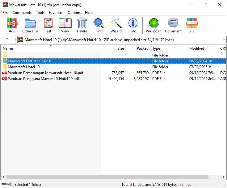 Buka fail .zip atau pendrive yang mengandungi installer Mawarsoft Hotel, kemudian buka folder "Mawarsoft Hotel 10".
