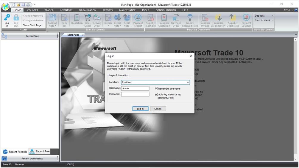 Apabila selesai pemasangan dan menjalankan perisian Mawarsoft Trade untuk kali pertama, anda perlu mengelog masuk ke pangkalan data. Untuk mengelog masuk, anda perlu mempunyai lokasi pangkalan data, username dan kata laluan. Bagi pengguna yang mengelog masuk ke pangkalan data untuk kali pertama dan dengan andaian menggunakan perisian server FlitGate yang dipasang pada komputer yang sama, maklumat log masuk adalah seperti berikut: