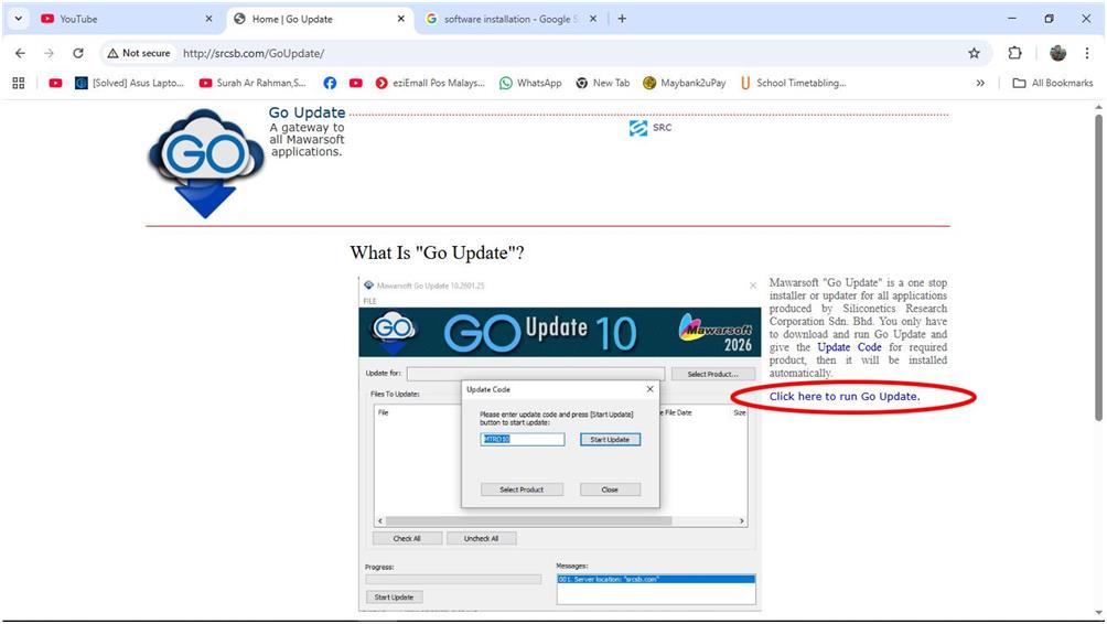 Lawati laman sesawang "http://www.srcsb.com/GoUpdate/", kemudian klik pautan "Click here to run Go Update". Apabila selesai, fail GoUpdate.exe akan dimuat-turun dan disimpan di folder "Download".